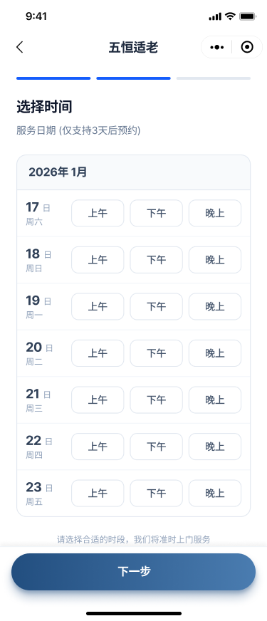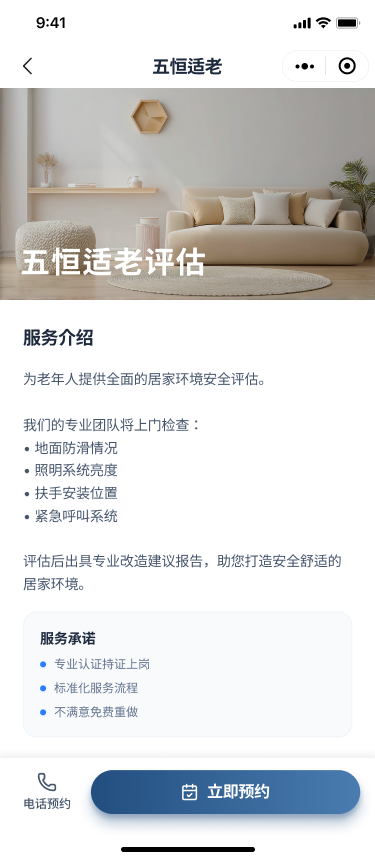 1、适老评估:上门测评居家环境是否符合养老标准,是否有易发事故风险点